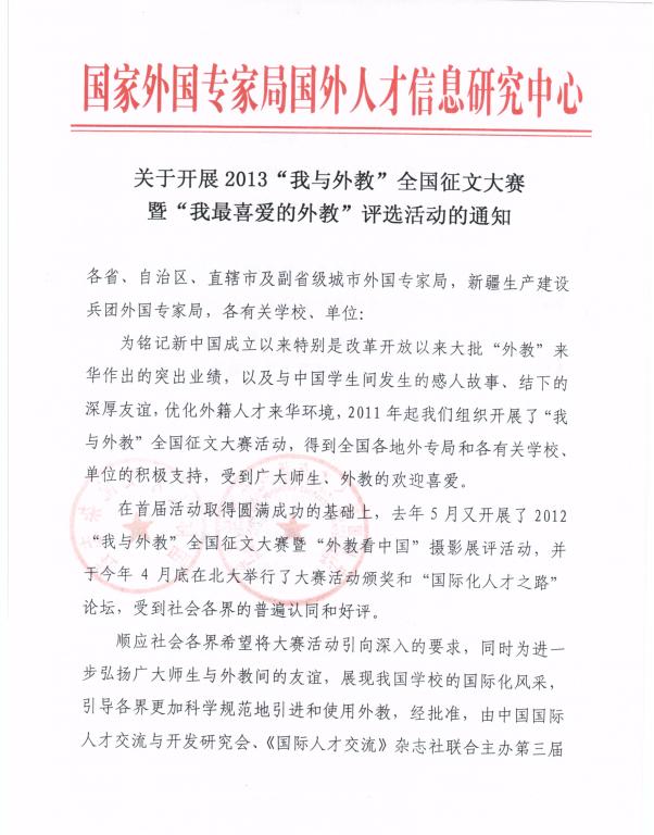 关于开展2013年“我与外教”全国征文大赛暨“我最喜爱的外教”评选活动的通知