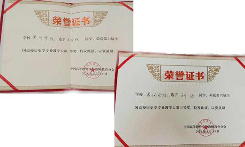 本网讯(特约记者 杨正阳)5月16—19日,由中国高等教育学会、全国历史教师教育专业委员会联合主办的第六届全国高等师范院校历史学专业本科生教学技能比赛在云南师范大学成功举办,我校文化旅游学院2016级历史班刘浩同学荣获说课组三等奖,王宇欣同学荣获讲课组三等奖。