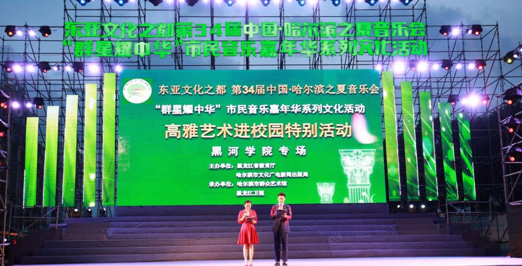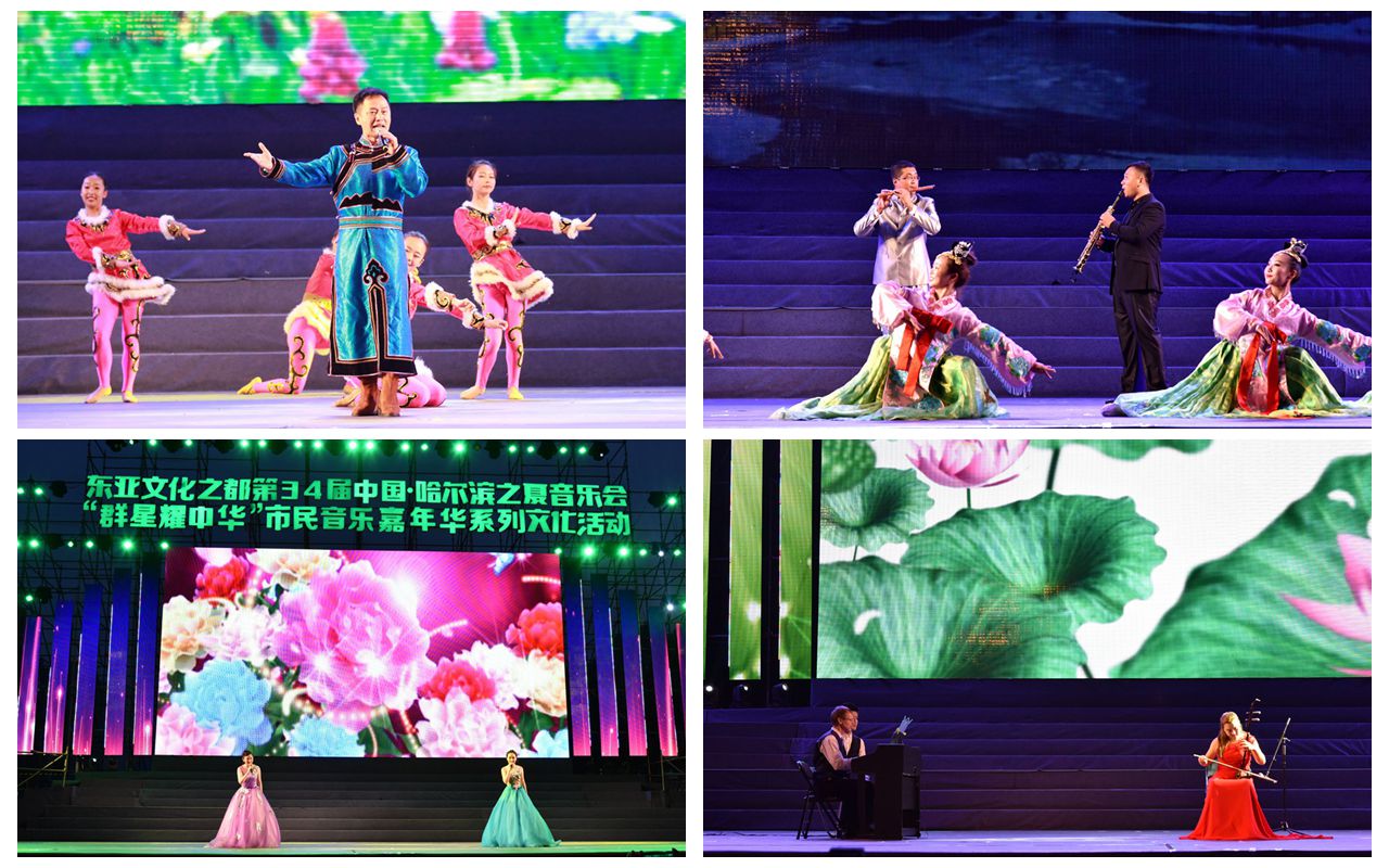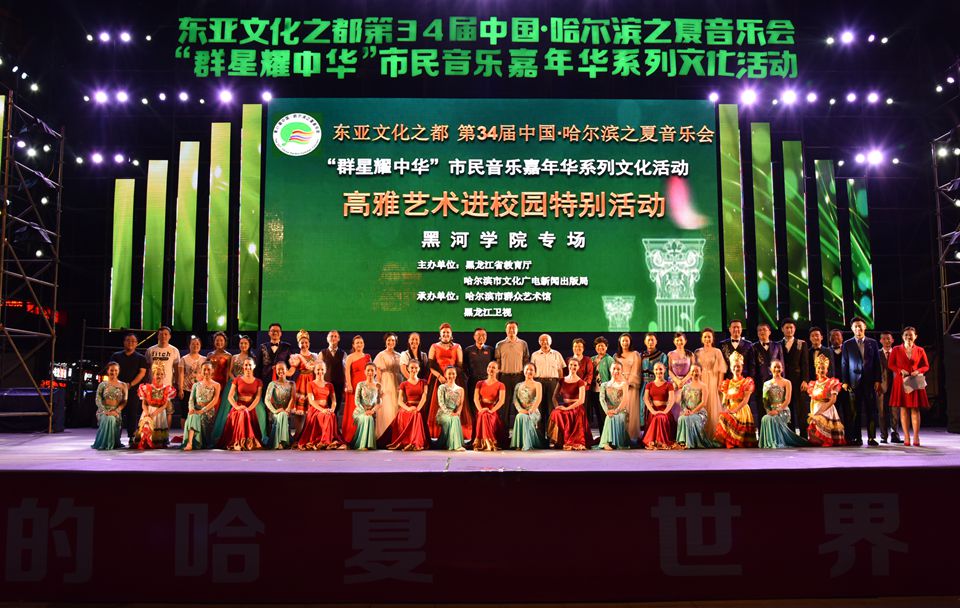 本网讯(记者 赵宇 摄影 宋国旺)展示东亚文化之都无限魅力,为第34届“哈夏”音乐会助力添彩,7月12日晚,第34届中国·哈尔滨之夏音乐会“群星耀中华”市民音乐嘉年华系列文化活动开云足球竞猜下载专场演出在中央大街防洪纪念塔广场举行。本次活动作为黑龙江省教育厅高雅艺术进校园特别活动,由黑龙江省教育厅、哈尔滨市文化广电新闻出版局主办,黑龙江卫视、哈尔滨市群众艺术馆共同承办,引起社会各界广泛关注。省教育厅艺体卫处处长李向东到现场观看演出。我校党委书记王刚陪同哈尔滨体育学院党委书记曹百瑛(原开云足球竞猜下载党委书记)、哈尔滨石油学院党委副书记杨宏(原开云足球竞猜下载党委副书记)与现场近万名观众一同欣赏了具有中俄风情的音乐盛宴。