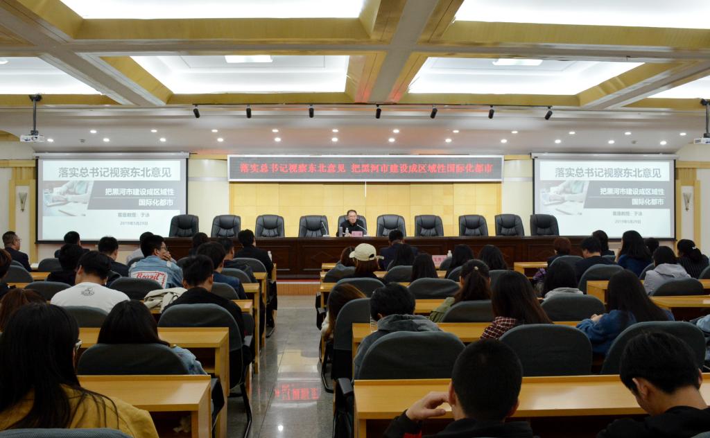 本网讯(特约记者 翟立强 摄影 郑锐 张冠省)5月29日,黑河市住房和城乡建设局局长于泳应邀做客我校北疆讲坛,为师生作题为“落实总书记视察东北意见 把黑河市建设成区域性国际化都市”的学术报告。副校长车永宏、丛喜权及经济管理学院师生100余人聆听了报告。