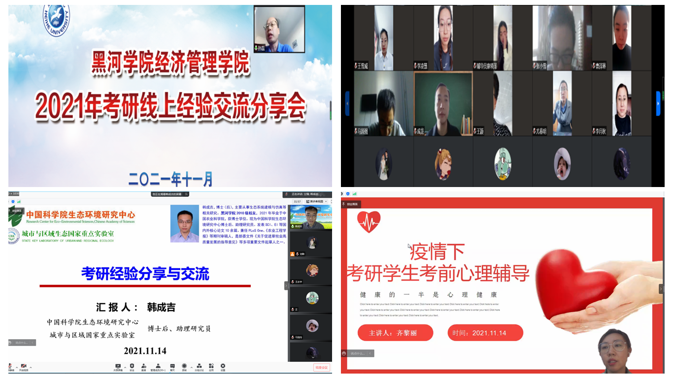 本网讯(特约记者 赵环宇)为进一步帮助2021年考研备考学生明确考研目标,掌握考研方法,了解考研信息,切实为学生解难题、办实事,11月14日,经济管理学院举办了2021年考研经验线上分享交流会,学院负责人、全体教师、三位经济管理学院优秀毕业生韩成吉、孔祥菁、任万强及各年级有考研意向的百余名学生参加会议。
