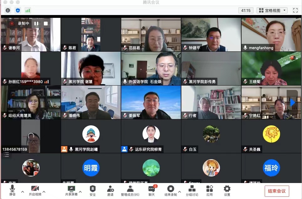 会上,远东研究院院长、黑龙江省俄罗斯远东研究学术交流基地负责人谢春河教授汇报基地基本情况,宣读了基地学术委员会委员名单,并做会议总结。远东研究院名誉院长、俄罗斯阿穆尔国立大学荣誉博士、中外文化交流史研究专业委员会理事长王禹浪教授,中国社会科学院世界历史研究所俄罗斯中亚史研究室主任、中国社会科学院大学历史学院教授王晓菊研究员,黑龙江省社会科学院俄罗斯研究所负责人钟建平研究员,黑龙江大学中俄人文交流研究中心主任、博士生导师姜振军教授,内蒙古社会科学院“一带一路”研究所所长范丽君研究员,牡丹江师范学院中国抗联研究中心副主任陈君副教授、黑龙江大学历史文化旅游学院潘晓伟副教授、哈尔滨师范大学历史文化旅游学院南慧英副教授等八位学者,分别在线上围绕中俄黑龙江流域与远东的基本特性、当前中俄区域合作、帝俄晚期的西伯利亚开发、中俄蒙经济走廊建设、新冠疫情下俄罗斯远东地区社会经济现状、俄罗斯远东问题研究的三重维度、日本人在帝俄太平洋海域的渔业活动、俄国远东地区的东亚移民研究等问题进行深入研讨,并作主题报告。