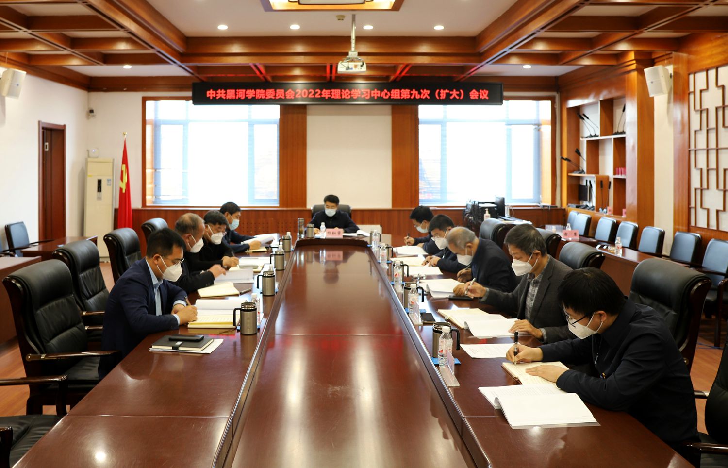 本网讯(记者 关月 摄影 郭瑞)10月24日,校党委书记杨弘宇在明德楼308会议室主持召开党委理论学习中心组第九次(扩大)会议,深入学习宣传贯彻党的二十大精神。党政领导班子成员参加会议。