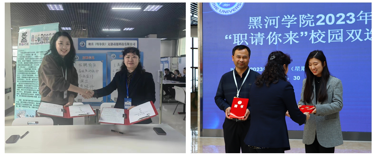 期间,招生就业处和相关各学院负责人为8位企业HR颁发聘书,聘请其为我校就业创业咨询师;我校招生就业处负责人与朝喜文创动漫科技有限公司负责人签署就业基地合作协议。