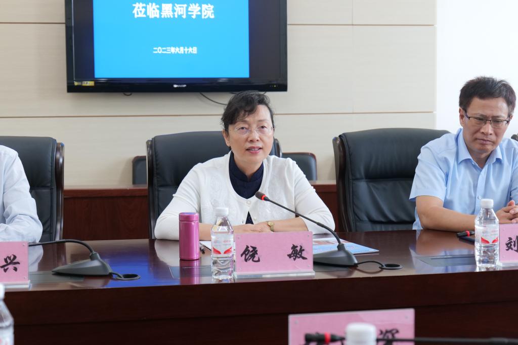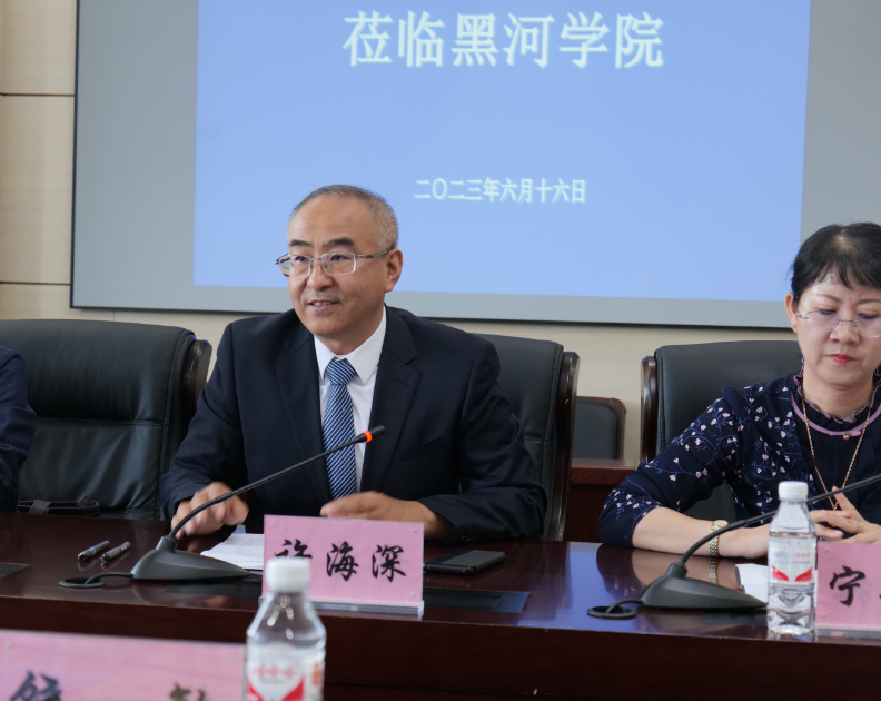 座谈会上,许海深代表学校对饶敏一行表示欢迎,并围绕我校“十四五”的发展目标、特色办学定位以及图书馆馆藏文献建设等方面对我校发展建设情况进行了简要介绍。许海深指出旅俄华侨文献资源建设是图书馆特色文献资源建设的一部分,图书馆特色文献资源不仅为研究人员提供丰富的学术资源,更有助于保护和传承旅俄华侨文化遗产,推动旅俄华侨研究工作的深入发展和繁荣。希望以此次调研座谈为契机,两校找准切合点,建立合作机制,加强图书馆馆际合作交流,充分发挥图书馆文献资源的作用,为龙江经济文化发展服务,为中俄文化交流服务。