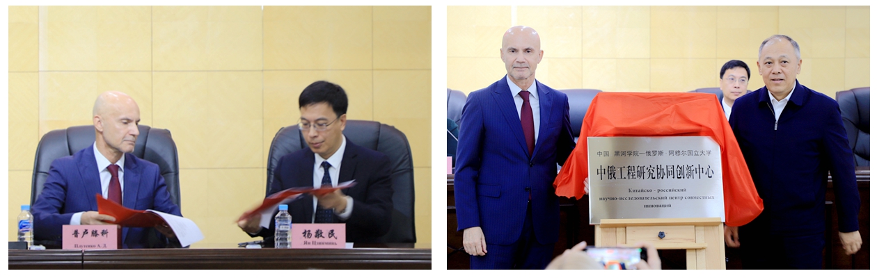 杨敬民与普卢滕科·安德烈·多利耶维奇为“中俄工程研究协同创新中心”签约;王喜林与普卢滕科·安德烈·多利耶维奇为“中俄工程研究协同创新中心”揭牌。