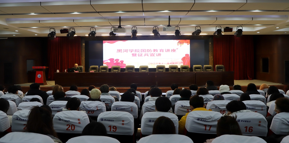 本网讯(特约记者 梁策 摄影 王艺静)为进一步强化学生国防意识,培养学生爱党、爱国、爱社会主义的深厚情感,11月15日,我校特邀原黑龙江省军区战备建设局军训办副团职参谋、2020年全省军事理论教学巡回宣讲团团长杨宇中校在求知楼报告厅作《国防连着你我他》国防教育专题讲座暨征兵宣讲,800余名2023级学生聆听讲座。讲座由学生工作部(处)·武装部负责人主持。