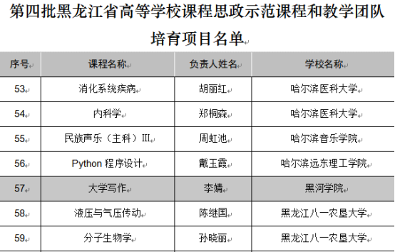 本网讯(特约记者 姚瑶)近日,黑龙江省教育厅公布黑龙江省高等学校第四批课程思政示范课程和教学团队培育项目、第二批课程思政优秀教学案例名单,我校李婧老师的《大学写作》课程成功入围第四批黑龙江省高等学校课程思政示范培育项目,付中凤老师的《践行龙江“五色”育人,树新时代艺术创新人才——我国冰雪题材地域油画风景创作理论本质揭示》、何冰老师的《真理的味道》、刘迪老师的《必须坚持和完善社会主义基本经济制度》和范会敏老师的《教学方法之讨论法》案例被确定为第二批黑龙江省高等学校课程思政优秀案例。