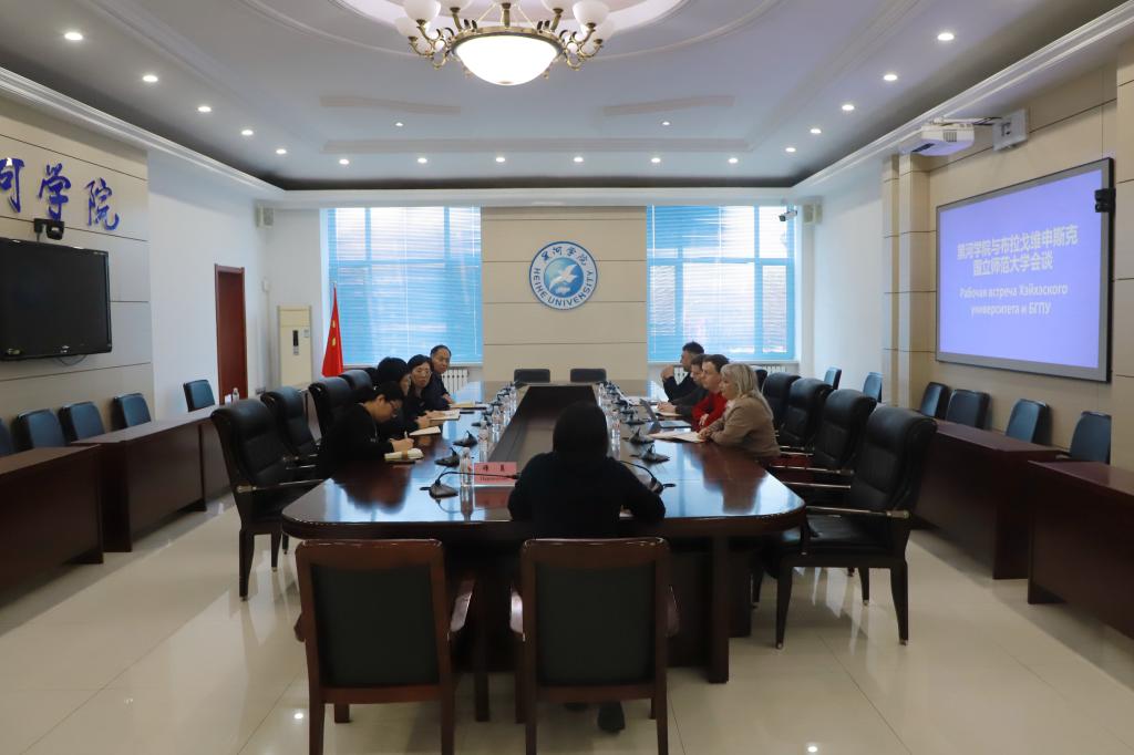 3月6日,俄罗斯布拉戈维申斯克国立师范大学外事处处长库哈连科·尼古拉·弗拉基米罗维奇、科研创新处处长库哈连科·谢尔盖·弗拉基米罗维奇等一行4人来访我校。学校党委委员、副院长谢慧率领相关部门、学院负责人热情接待了客人,并举行工作会谈。双方就进一步推进计算机专业外籍教师引智、高层次人才引进,继续举办“俄语——我心中的歌”大赛和中俄合作历史前景学术研讨会进行商讨。双方表示将继续推动两校间优质教育资源共享,提升两校国际化办学水平,进一步扩展中俄两国间的文化交流与合作。