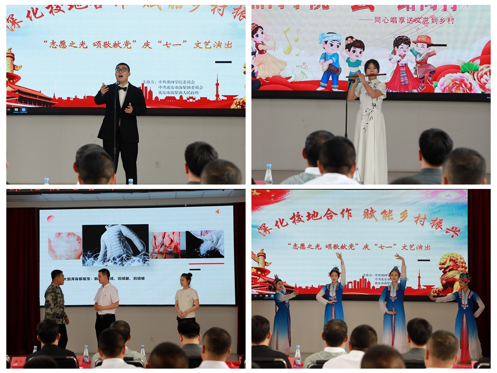 演出结束后,马克思主义学院教师张萌为北安市海星镇人民政府党员作“用好‘千万工程’经验 绘就乡村全面振兴画卷”专题讲座;校领导一行实地考察各村文化墙彩绘及镇村企业。