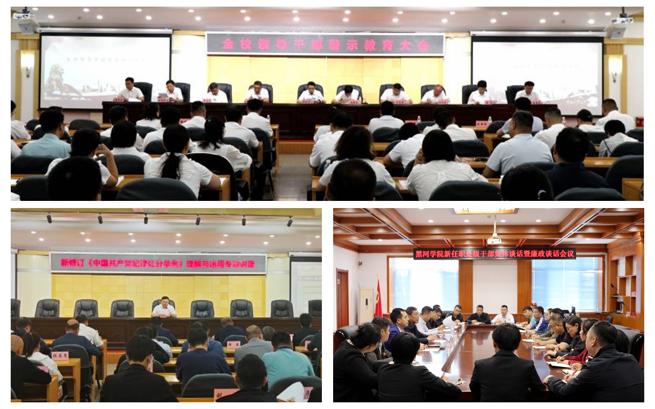 警示促廉,筑牢纪律防线。组织开展多种形式的警示教育活动,召开全校干部警示教育大会,干部签订廉洁承诺书206份,对新提职干部进行廉政谈话,做好关键时间节点廉政提醒,集中观看警示教育片,通过“片中事”“案中人”警示党员领导干部廉洁从政,秉公用权。组织领导干部参观黑河市廉政教育中心,举办《新修订〈中国共产党纪律处分条例〉解读与运用》党纪学习教育专题讲座,开展廉洁教育主题党日活动,剖析典型案例,重温入党誓词,淬炼理想信念,强化党性修养,坚定“身在最北方、心向党中央”的政治忠诚。