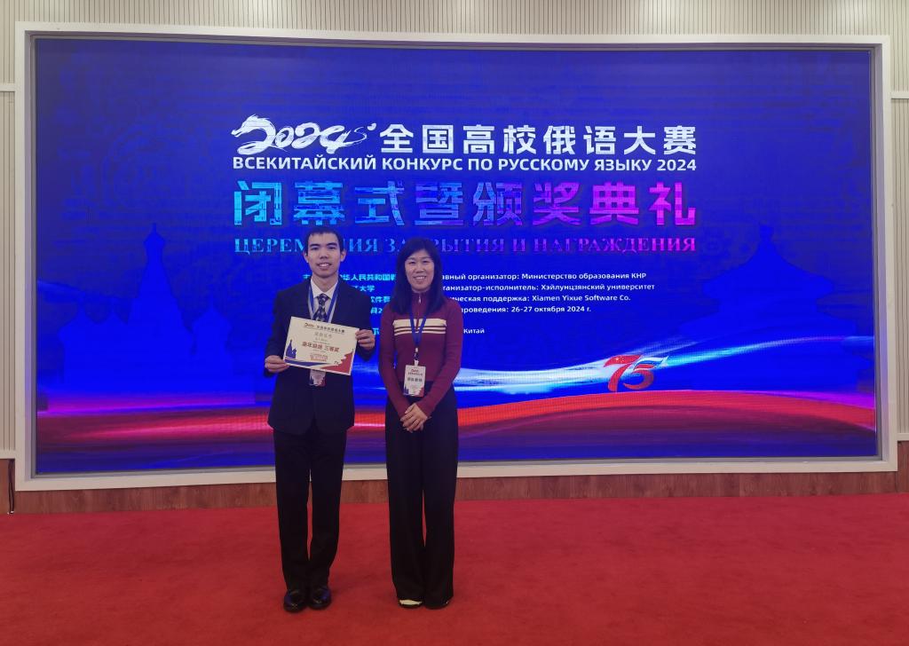 比赛分为初赛、复赛和决赛三部分,设有低年级组、高年级组和研究生组三个组别。我校外国语学院张荆纬豪、赵凡铭两名学生分别参加了低年级组和高年级组的比赛。经过激烈角逐,最终赵凡铭同学以全国排名第9的成绩荣获2024全国高校俄语大赛高年级组三等奖;张荆纬豪以笔试全国排名第47的成绩获得2024全国高校俄语大赛低年级组优秀奖。自2013年以来,我校学生第四次在全国高校俄语大赛中获奖,充分体现了外语专业高水平复合型、应用型开云网站登录理念。