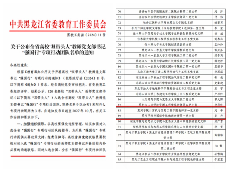 近日,黑龙江省委教育工作委员会公布了全省高校“双带头人”教师党支部书记“强国行”专项行动团队名单,我校计算机与信息工程学院教师第一党支部和外国语学院俄语教师第一党支部成功入选全省高校“强国行”专项行动团队,这是我校深入实施教师党支部书记“双带头人”培育工程以来,首次在“双带头人”教师党支部书记队伍建设方面获评省级党建工作成果。学校将以入选为契机,进一步加强基层党组织建设,积极开展党建联建、教育服务、科技赋能、实践育人等各项任务,推进“双带头人”教师党支部内涵式发展,深入推动党建与业务的深度融合,引导广大党员干部和师生在服务龙江和学校高质量发展中做出更大贡献。