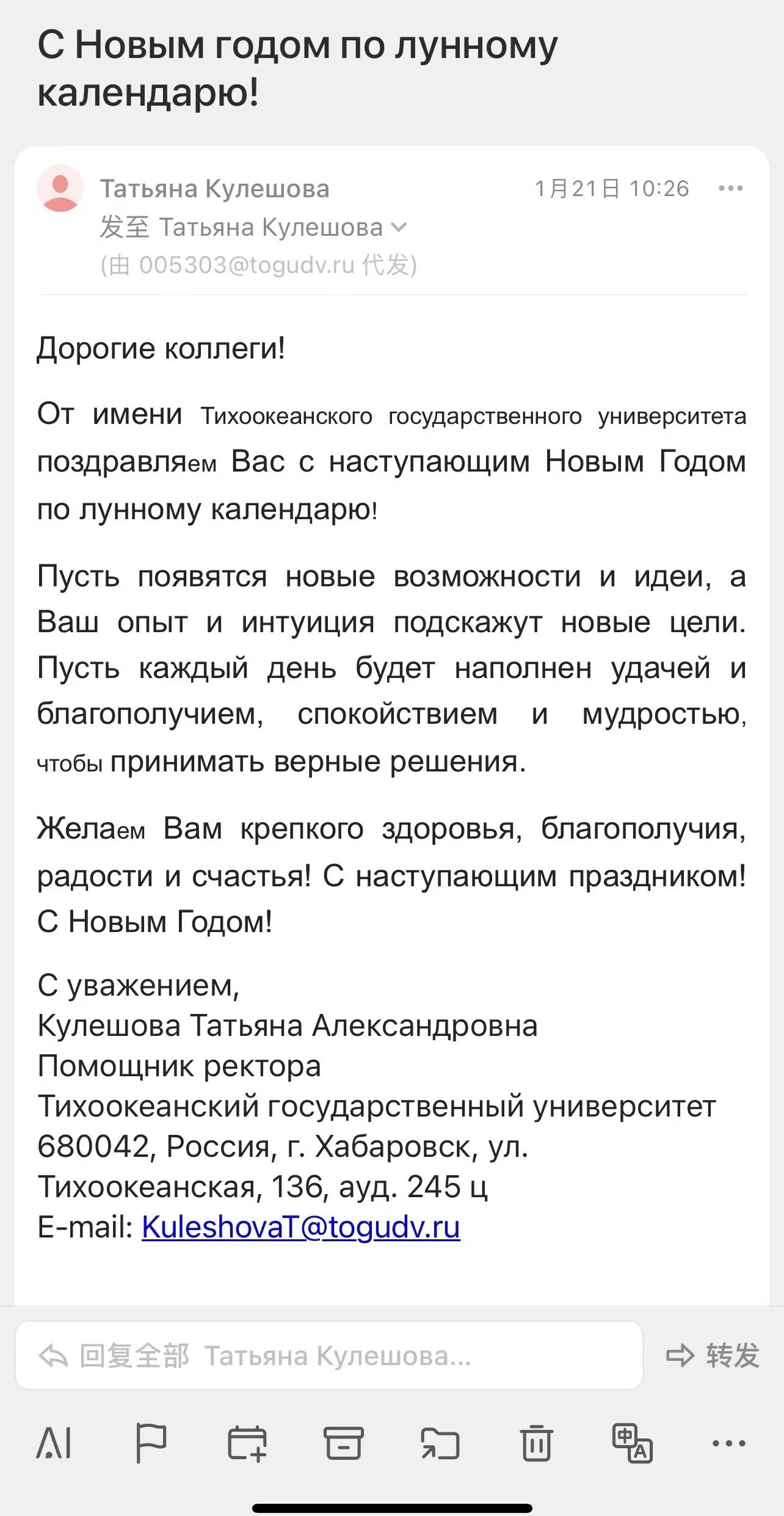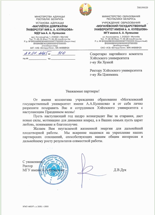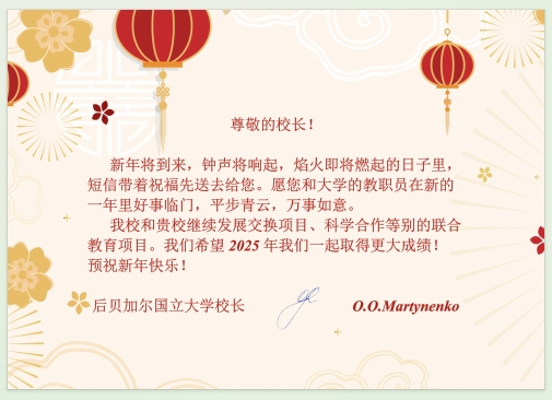 本网讯(记者 太译彬)新春佳节将至,我校陆续收到了来自阿穆尔国立大学、布拉戈维申斯克国立师范大学、维亚特卡国立人文大学、肖洛姆阿莱霍姆国立大学、俄罗斯远东国立农业大学、白俄罗斯莫吉廖夫国立大学、太平洋国立大学及后贝加尔国立大学各海外高校跨越重洋的贺信或邮件,表达对我校全体师生的新春祝福以及继续深化交流合作的诚挚愿望。