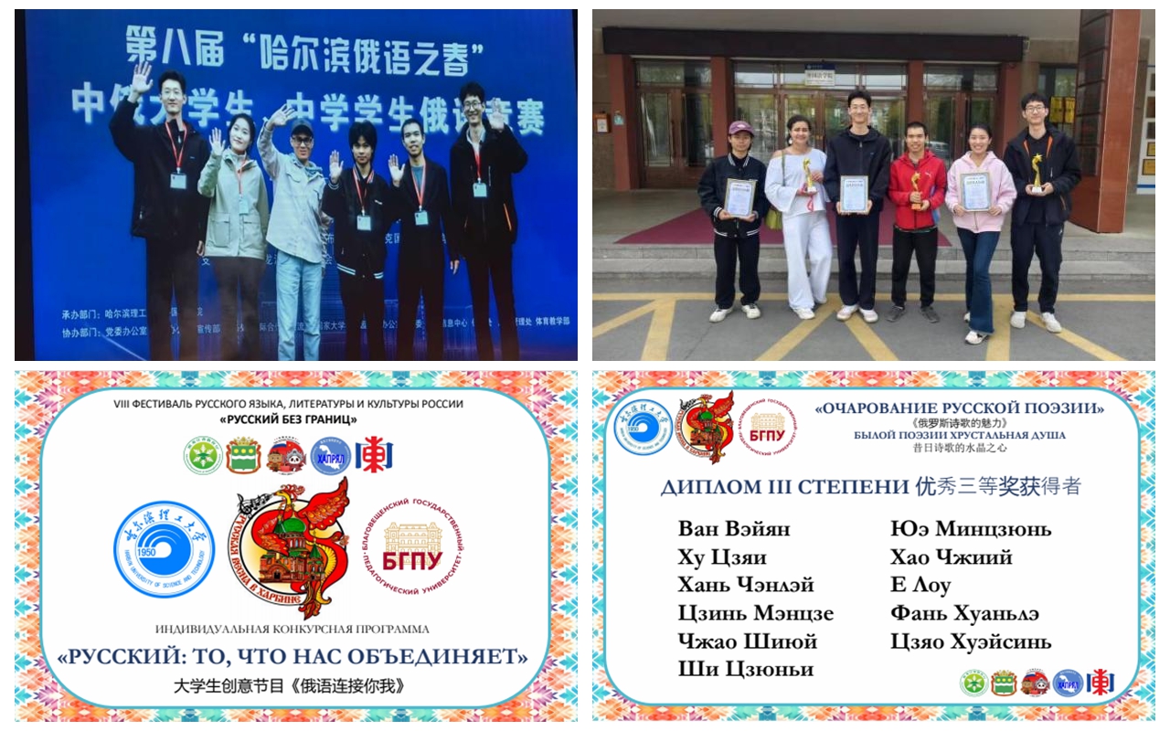 此次比赛分为团队赛和个人赛,通过线上与线下两种形式,吸引了来自中俄31所院校220余位选手参加比赛。我校外国语学院选派五名学生参加比赛,经过激烈角逐,我校学子在俄语诗歌朗诵项目中荣获二等奖、俄语歌曲比赛中荣获二等奖、俄语戏剧表演比赛中荣获三等奖,参与线上比赛的韩诚磊同学取得优秀三等奖。