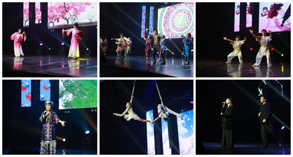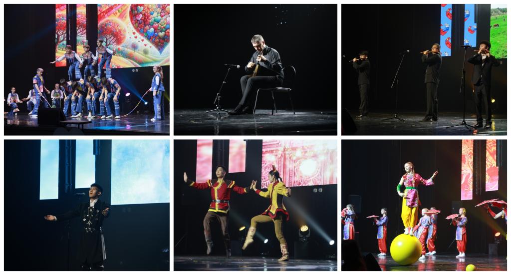 文艺演出精彩纷呈,开场杂技《向上》以高难度的动作和完美的配合,展现了青年奋发向上的精神风貌;巴拉莱卡琴独奏《灰姑娘》琴声悠扬,将俄罗斯童话的浪漫情怀表现得淋漓尽致;竹笛重奏《草原小姐妹》旋律优美,仿佛将观众带到了广袤的草原;萨哈民族旋律《萨哈之声》独特的喉唱技法震撼全场,演唱者用嗓音模拟出风声、马鸣和流水的音效,展现了萨哈民族对自然的崇敬;舞蹈《问候舞》灵动身姿,流畅动作,充满了浓厚的艺术气息;杂技表演《龙》在滚动的球体上完成各种高难度平衡动作,精湛技艺令人叹为观止;双人舞《喜上眉梢》表演者如蝴蝶般在舞台上翩翩起舞,营造出唯美的艺术意境;武术表演《武韵风华》刚劲有力,一招一式尽显中华功夫的深厚底蕴;歌曲《龙船调》细腻的情感表达与恰到好处的节奏把控,使得整首歌曲既充满活力又不失传统音乐的庄重感;空中双人舞表演者在灯光的映衬下,如同两只自由的飞鸟,在空中划出优美的弧线;俄罗斯学生用中文演唱的歌曲《完美生活》歌声极具感染力,唱出了青年人对美好未来的向往;压轴节目歌伴舞《最佳邻居》歌声欢快、舞姿优雅,用艺术完美诠释了中俄两国毗邻而居的深厚情谊。