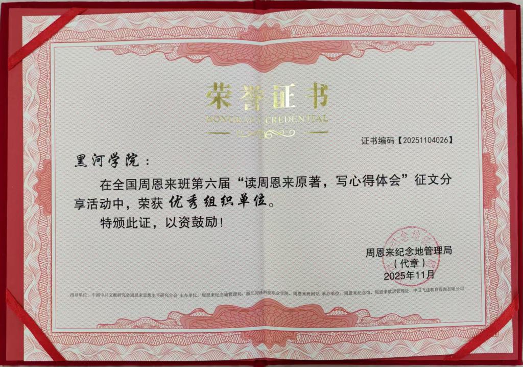 此次获奖,是我校用周恩来精神培根铸魂、为党育人为国育才的生动体现。面向未来,学校将以此为契机,以“周恩来班”创建为核心抓手,深度融入并持续打造“北疆冰凌”思政育人品牌,将服务国家兴边固疆战略与培养担当民族复兴大任的时代新人的使命紧密结合,引导广大师生从总理的光辉事迹中汲取磅礴力量,以扎根北疆、建功立业的实际行动,为推进中国式现代化龙江实践贡献青春与力量!
