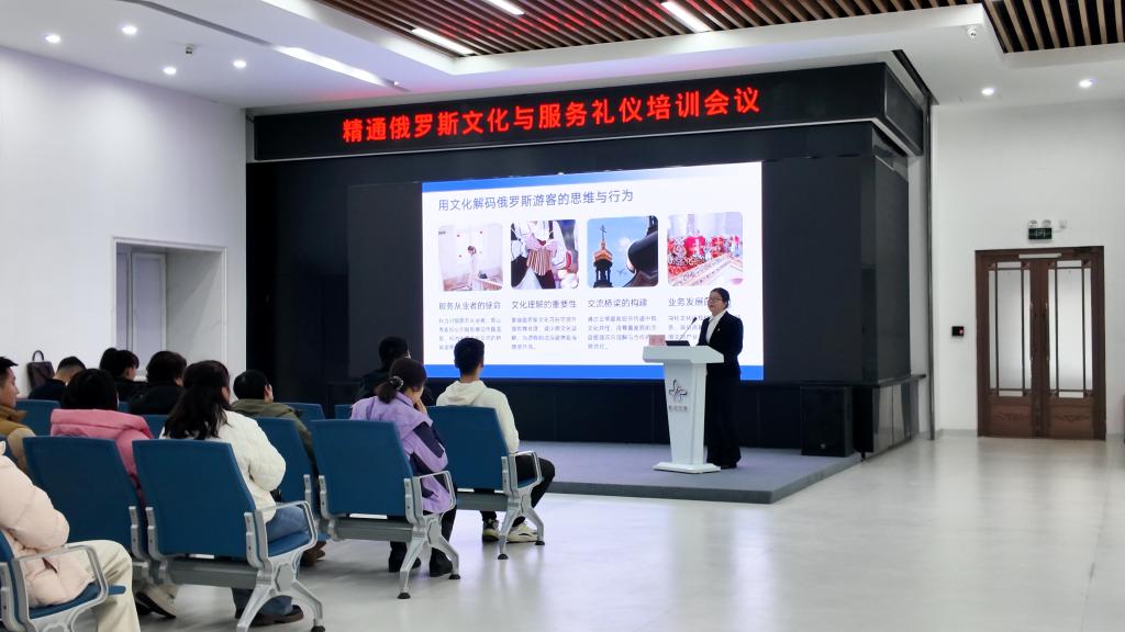 为深度响应“中国对俄罗斯持普通护照人员试行免签政策”新机遇,充分发挥高校外语人才与专业教学优势,11月12日,学校联合黑河市文化广电和旅游局,以“党建+业务”双融双促模式,联合举办“俄罗斯文化与服务礼仪”专题讲座,精准为全市涉旅一线从业人员“充电赋能”。