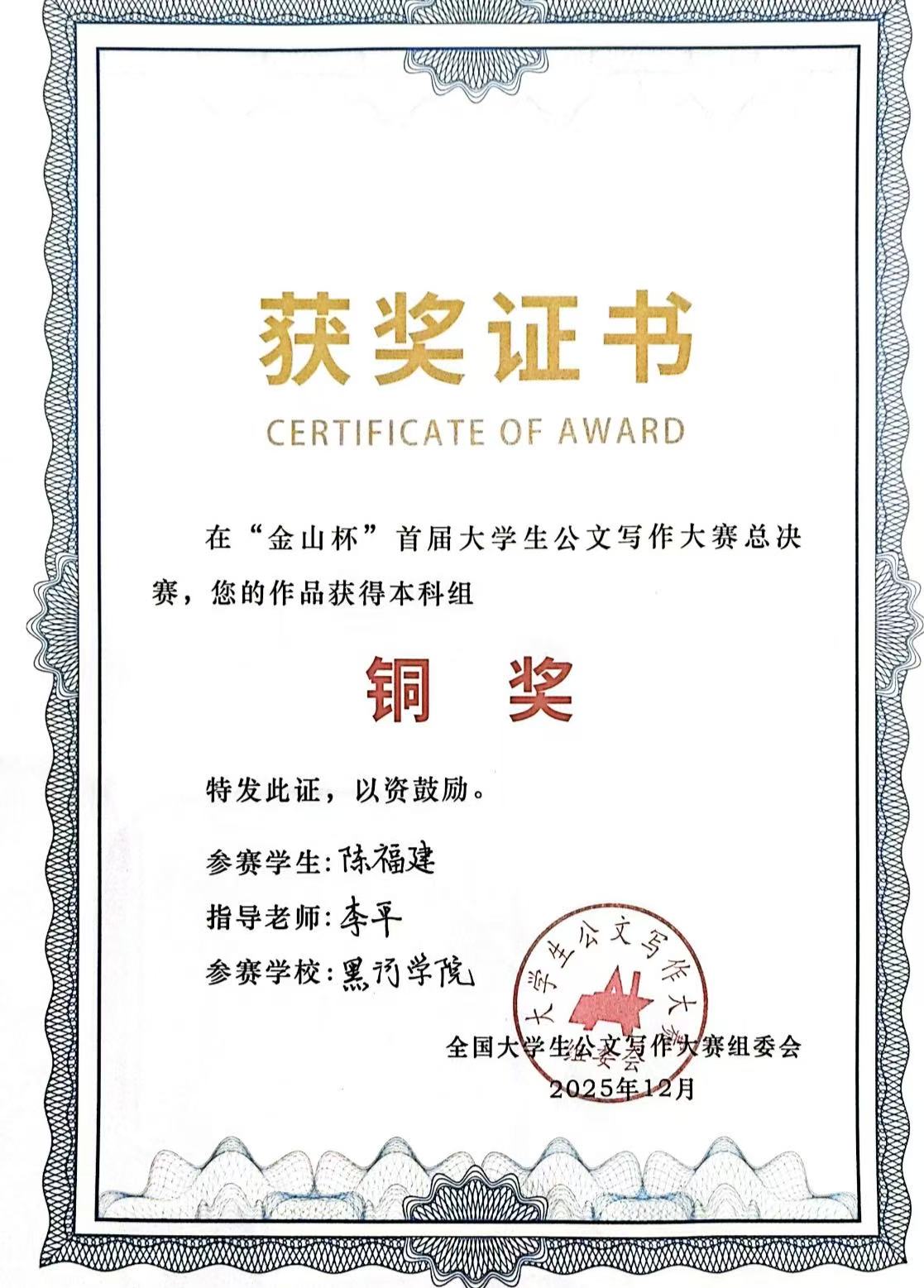 我校积极响应赛事组织,共有百余名同学参与角逐。人文传媒学院学生陈福建在比赛中表现卓越,历经重重考验,从全国5000名参赛者中崭露头角,成为进入总决赛的十五名选手之一。在总决赛中,陈福建同学发挥出色,荣获三等奖,指导教师李平亦荣获优秀指导教师称号。