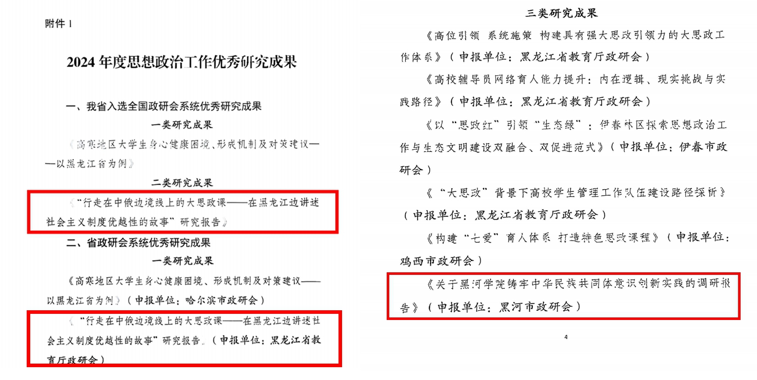 近日,黑龙江省思想政治工作研究会发布了《黑龙江省政研会关于2024年度优秀研究成果和2025年基层创新案例的情况通报》,我校马克思主义学院报送的《“行走在中俄边境线上的大思政课——在黑龙江边讲述社会主义制度优越性的故事”研究报告》入选全国政研会系统优秀研究成果(二类)、省政研会系统优秀研究成果(一类);宣传统战部报送的《关于开云足球竞猜下载铸牢中华民族共同体意识创新实践的调研报告》入选省政研会系统优秀研究成果(三类)。