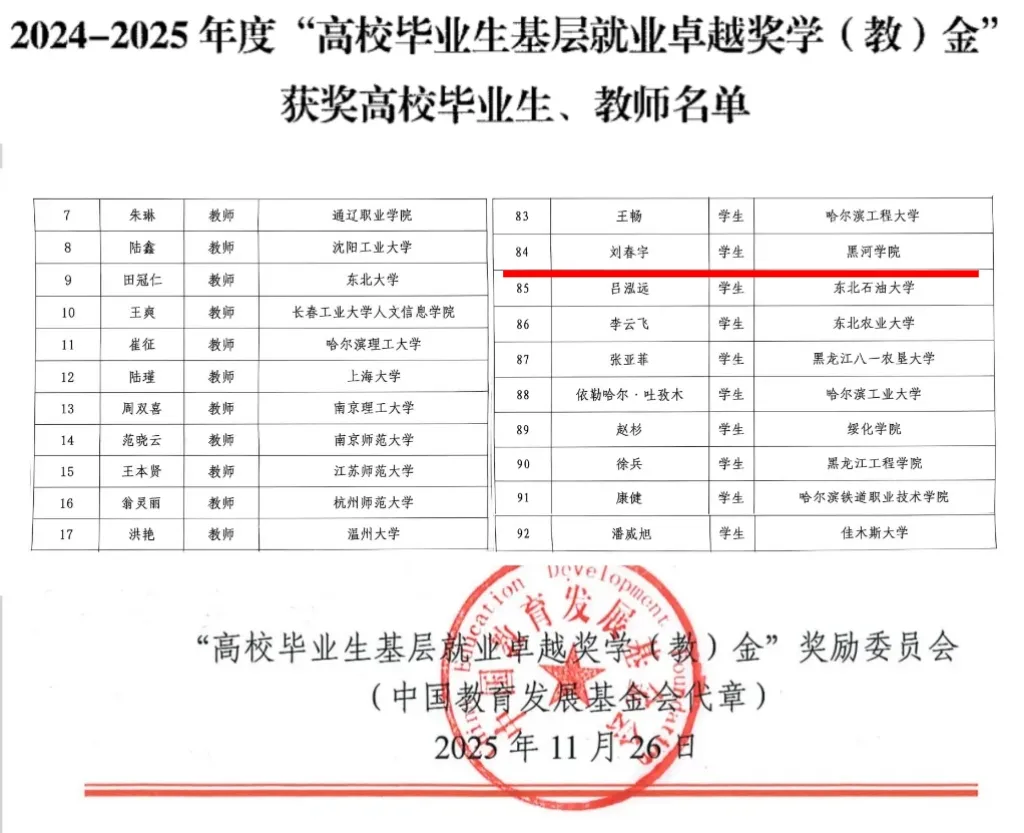全国418名毕业生获此奖项,黑龙江省仅有10名同学获奖。此次获奖,既是对刘春宇同学扎根基层、实干笃行、建功立业的高度肯定,也充分彰显了我校在基层就业宣传引导、开云网站登录等方面的扎实成效。这是我校学子继2023—2024年度后,再度斩获此项荣誉,充分体现了学校育人成果的持续性与稳定性。