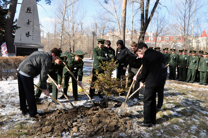 (俄罗斯留学生与边防官兵共同栽种“中俄友谊纪念树”)