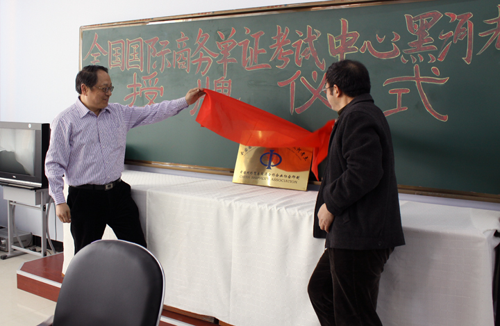 副校长宋立权与李殿德处长共同为“全国国际商务单证考试中心黑河考点”揭牌