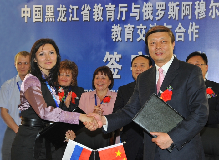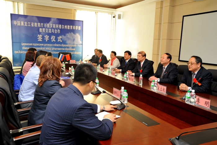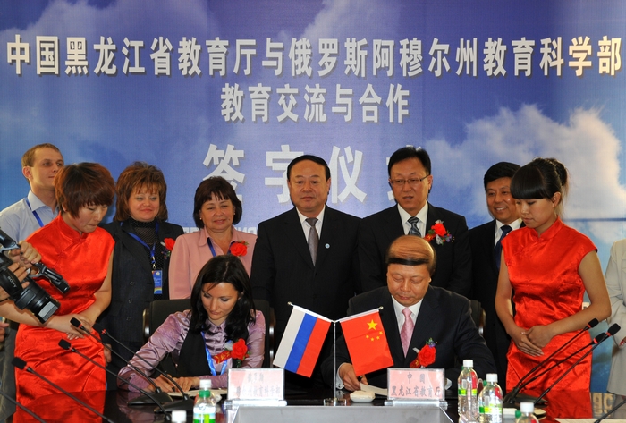 本网讯(记者 王佳 学生记者 卢月)为进一步促进中俄两国教育事业的发展,推动黑龙江省教育厅和阿穆尔州教育部及两省州学校的教育交流与合作,5月20日,中国·黑龙江省教育厅与俄罗斯·阿穆尔州教育科学部教育交流与合作签字仪式在我校隆重举行。