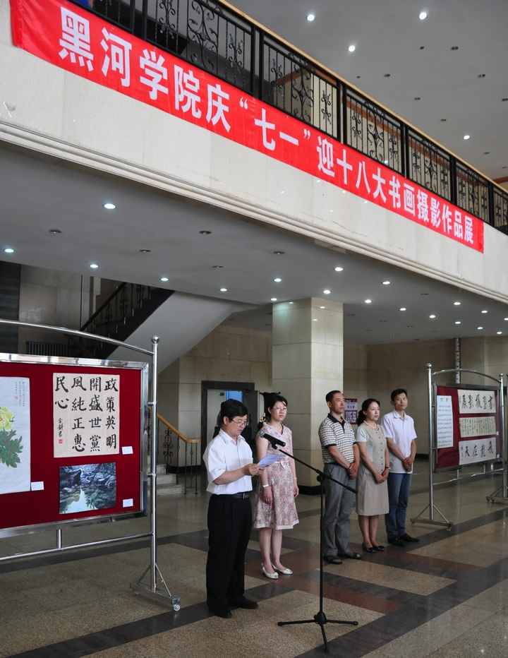 本网讯(姜辉 学生记者 张宇)6月28日,由院党委宣传统战部、院工会、美术系联合主办,教师书法协会承办的“庆七一 迎十八大”书画摄影作品展在综合楼一楼大厅隆重开幕。学院党委副书记孙作勤、工会主席李廷栋出席开幕式,学院宣传部、院团委负责人及各系(中心)党总支书记、副书记参加了书画展。