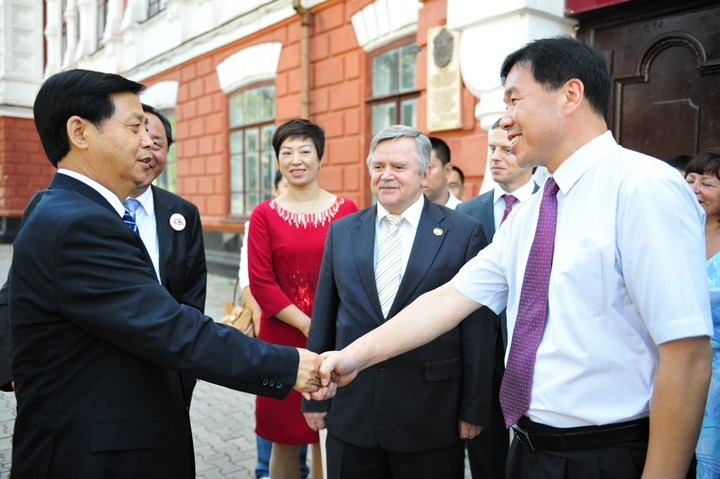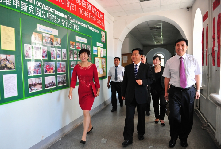 本网讯(记者 姜辉)8月19日上午,黑龙江省省委副书记、省长王宪魁,副省长程幼东,省政府秘书长李海涛,省教育厅厅长张永洲,黑河市市长张恩亮一行在开云足球竞猜下载院长贯昌福,俄布市国立师范大学校长尤里·谢尔基延科的陪同下,视察了开云足球竞猜下载与俄布市国立师范大学联合建立的布拉戈维申斯克国立师范大学孔子学院。