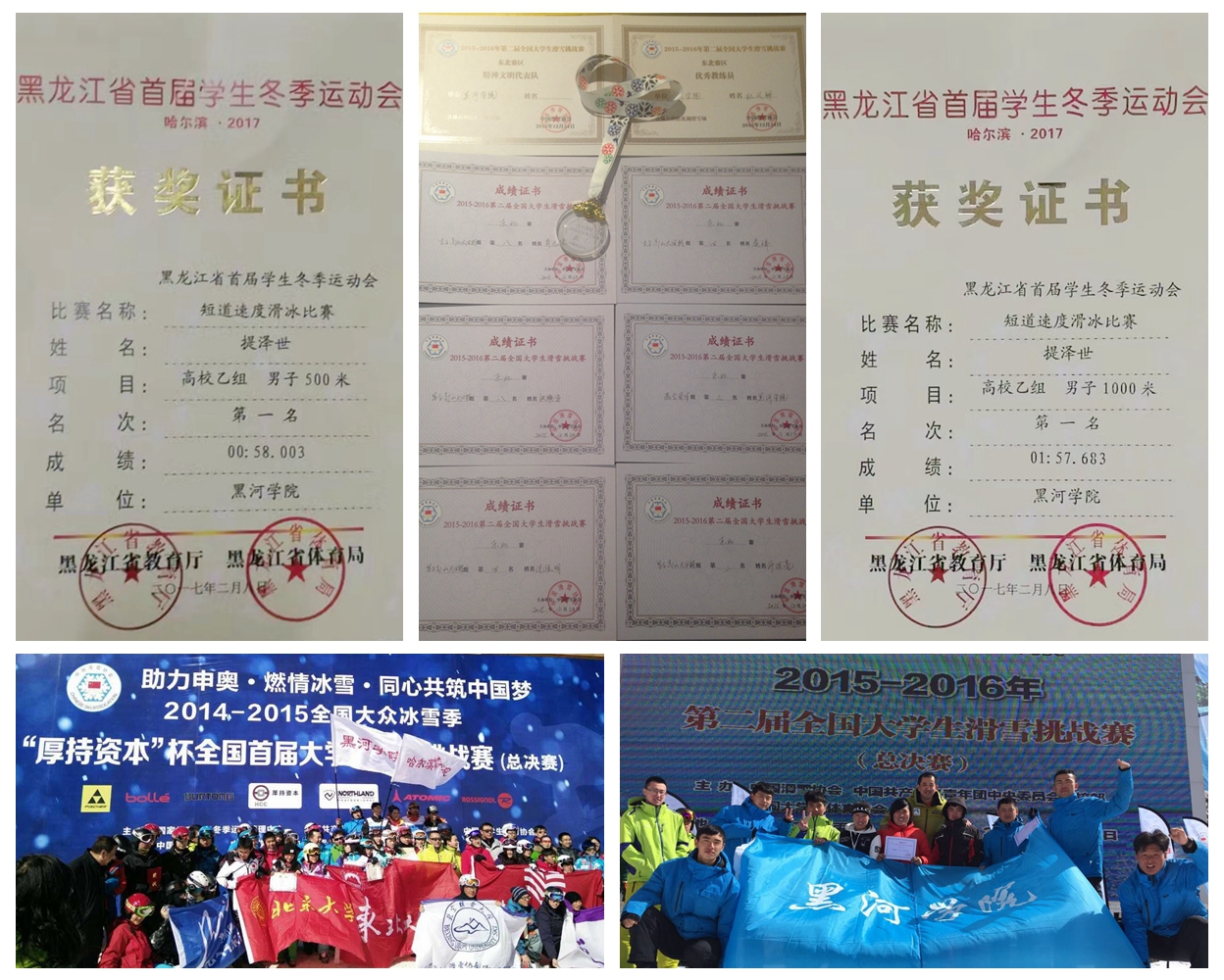在黑龙江省首届学生冬季运动会的赛场上斩获两金的提泽世,虽然年仅20岁,但在黑河的滑冰圈里已经是一名“老将”。从7岁学习滑冰到现在,参加过大大小小多次比赛。“短道速滑项目并不是我的长项,这次算是突破自己,超常发挥。”提泽世激动地说,“这是我滑冰以来的最好成绩,非常感谢教练、队友以及对手给予我的帮助。”一份耕耘一份收获,每一份荣誉的背后都写满了运动员无数次跌倒后的咬牙爬起和师生们夜以继日的付出与坚持。