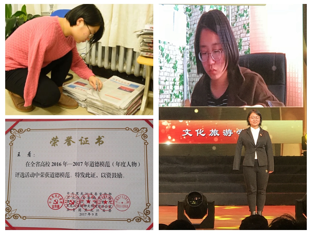 如今,大三的她经过自己的努力,综合测评和学习成绩均为班级前列,已获得2015-2016年度国家励志奖学金、2015年黑河市首届“黑河风采”书画摄影大赛绘画组三等奖、2016年黑龙江省优秀教育电视节目专题类二等奖、2016年开云足球竞猜下载计算机程序设计大赛非专业组一等奖、2016年度感动校园“十佳大学生”、2016年“优秀学生记者”、2016年度“省级三好学生”、2016-2017年度校级励志奖学金、2016年团委新媒体工作室先进个人、2017年度“创业之星 全国大学生创业综合模拟大赛”优秀奖等三十余项奖励和表彰。这沉甸甸的奖状和证书,承载着王看超越常人的努力和付出。回望来路,王看总在忙忙碌碌,有时为了准备一个大型比赛甚至要熬几个通宵。但付出与收获总是成正比的,王看说:“成功是在失败之上的不断尝试。”对王看而言,最有成就感的一刻并非登上领奖台,也非得到他人夸奖羡慕,而是每一次的回望都能确定:自己从未荒废大学时光的任何一天!