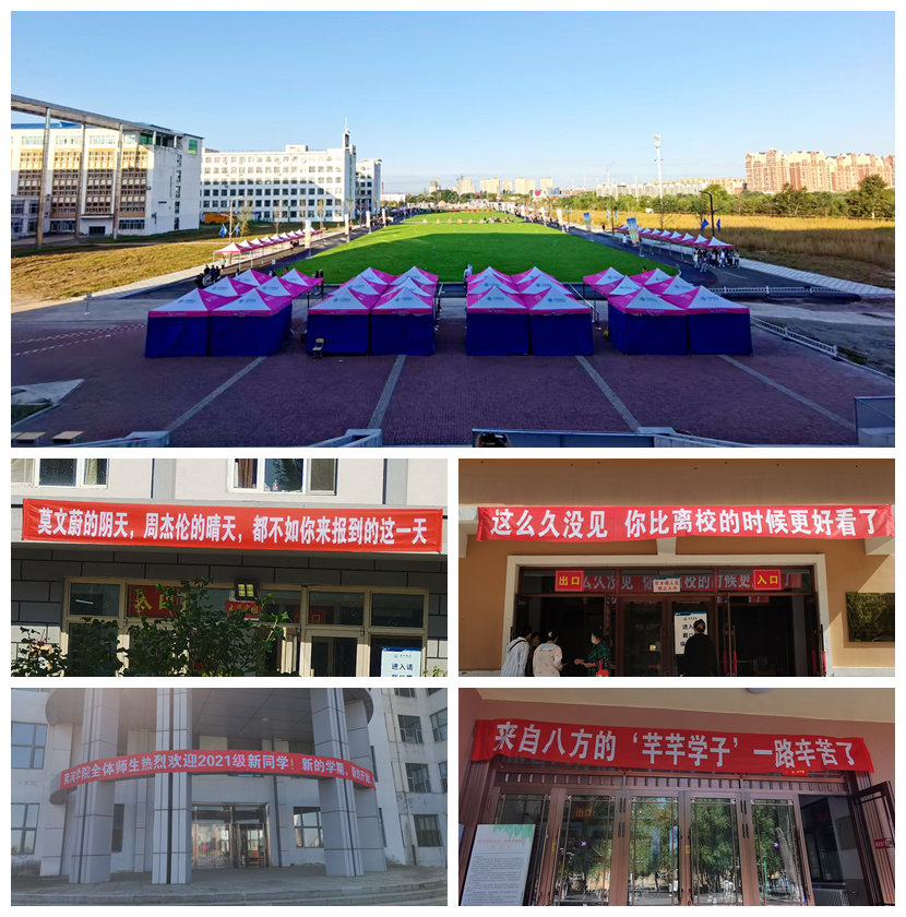 为了使初尝独立的新生们一踏入校门就感受到了来自学校各方的热情和温暖,学校营造更加多元、丰富的迎新氛围。校园里,“乘风破浪,披荆斩棘,一往无前,未来可期”“来自八方的莘莘学子一路辛苦了”“终于等到你,繁华自今日起”“花花世界迷人眼,学院萌新最耀眼”……一条条醒目的横幅,一面面迎风飘扬的刀旗,欢迎着新同学的到来。学校还专门制作了2021级新生打卡点、手持打卡卡片,让同学们和家长留下灿烂的瞬间的同时,寓意着从此踏上了新的征程。