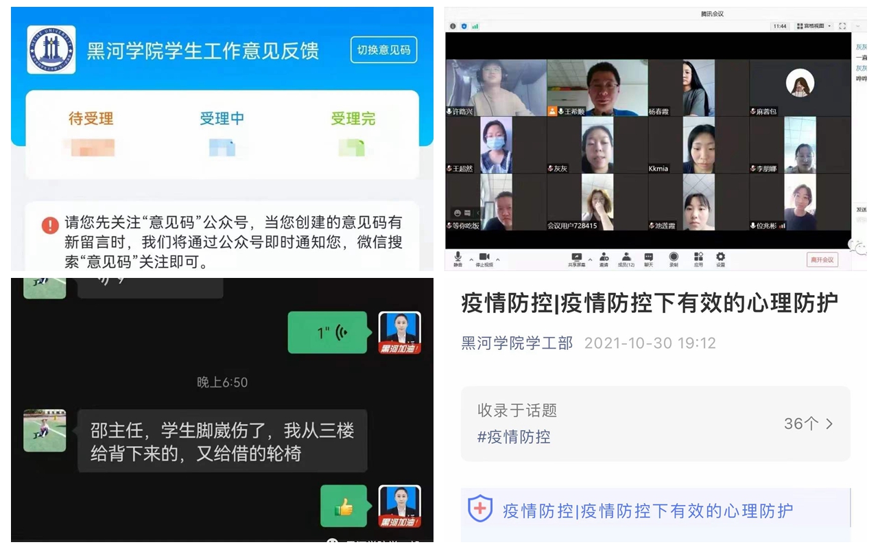 在这个特殊时期,各学院教师在保证教学质量“不打折扣”的同时,与学生们一起隔离疫情不隔离爱。教师们将“生命至上,举国同心,舍生忘死,尊重科学,命运与共”伟大抗疫精神融入课堂之中,并通过电话、微信、QQ等方式与学生实时沟通,为学生答疑解惑,引导学生理性面对疫情。各学院也纷纷发动团支部、各班级组织形式多样的战“疫”团活、主题班会活动;通过开展线上支部会、线上学生工作会、制作辅导员给学生一封信短视频、“不放弃”手语操、发布《寝室文明公约》等方式,表达特殊时期的温情与希望;组建“送饭小分队”,全力保障校内临时健康监测的同学饮食和学习生活。此外,正在参加顶岗实践学生也分别在北安、五大连池、孙吴等地积极投身疫情防控工作,在战“疫”一线展现当代大学生的责任与担当。