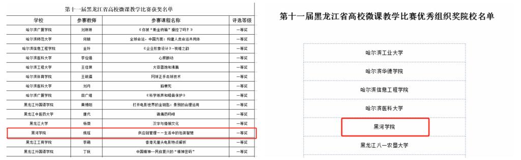 7月2日,由黑龙江省高校师资培训中心组织的第十一届黑龙江省高校微课教学比赛公示最终比赛结果,我校经济管理学院教师姚瑶的《供应链管理——生活中的包装智慧》获得本科组一等奖,实现了我校省级微课教学比赛一等奖零的突破。我校荣获“优秀组织奖”获奖单位殊荣。本次微课教学大赛,展现了我校教师积极向上的精神面貌,进一步点燃了教师们更新教学观念和应用现代教育教学手段的热情,对进一步提升课堂教学质量起到推助作用。