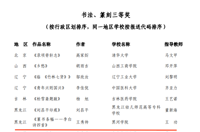 本网讯(特约记者 赵淑燕)近日,教育部发布了《教育部办公厅关于公布全国第七届大学生艺术展演活动优秀组织奖及各项目评选结果的通知》,我校选送的书法作品荣获三等奖。