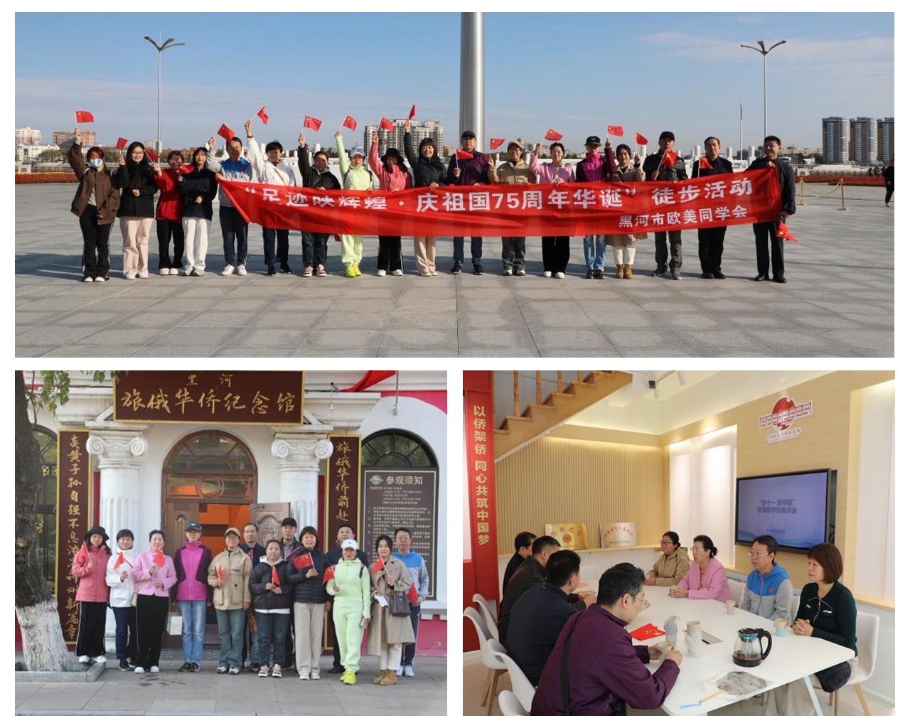 清晨,留学归国人员齐聚黑龙江江畔,参加了庄严而隆重的国庆升旗仪式。伴随着雄壮的国歌声,成员们心中涌动着对祖国无限的热爱和崇高敬意。随后,留学人员开展了“足迹映辉煌 庆祖国75周年华诞”徒步活动,沿途参观了黑河市旅俄华侨纪念馆,通过实地研学,留学人员更加深入地了解中俄文化交流的历史和旅俄华侨的奋斗历程。徒步活动后,召开了“携手前行 共话未来”座谈会,我校留学归国人员结合自身经历和工作实际,就如何更好地发挥归国留学人员的优势和作用、如何促进中俄文化交流与合作等问题发表观点看法,提出建议,共同为学校发展建设和龙江全面振兴全方位振兴贡献智慧。