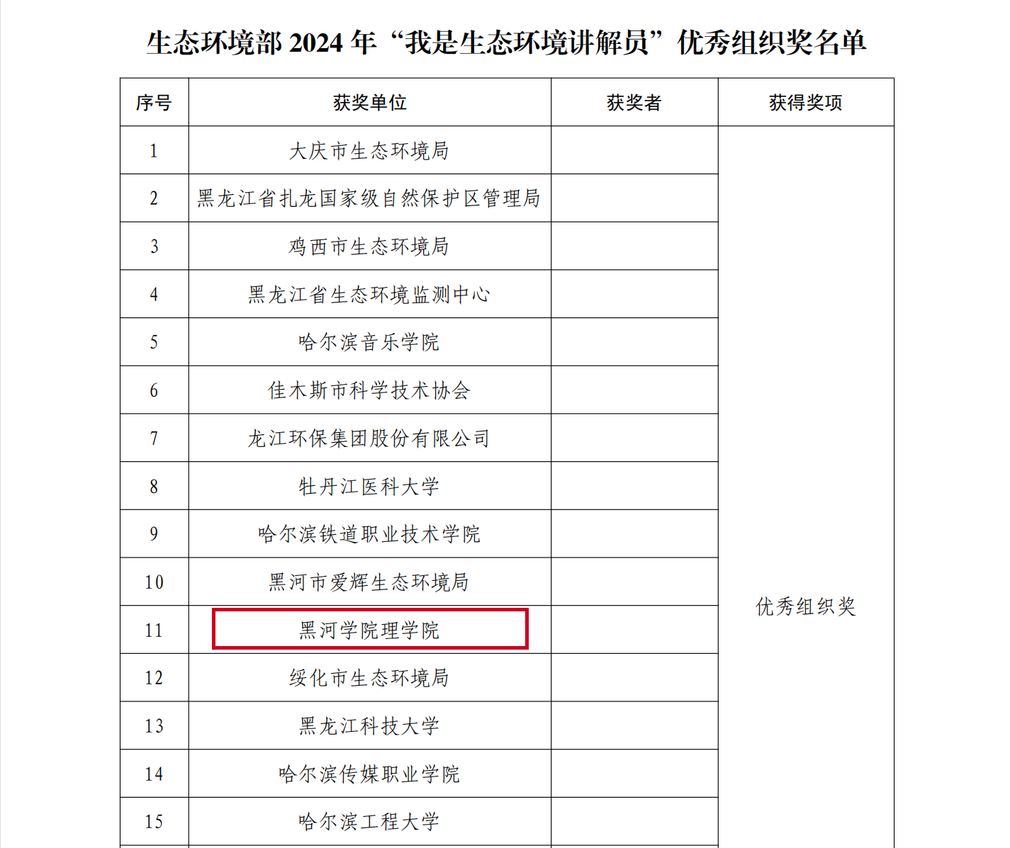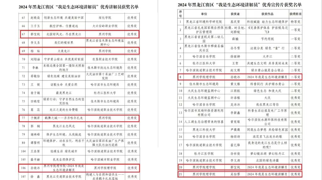 本网讯(记者 黄思翼)近日,黑龙江省生态环境厅发布了《关于2024年黑龙江赛区“我是生态环境讲解员”活动获奖情况的通报》,其中我校理学院荣获“优秀组织奖”;我校郭宝纯、杨灿、于婉君、孙晓冰荣获“优秀讲解员”优秀奖;孙晓冰荣获“优秀宣传片”二等奖;郭宝纯、吴怡霏荣获“优秀宣传片”优秀奖。