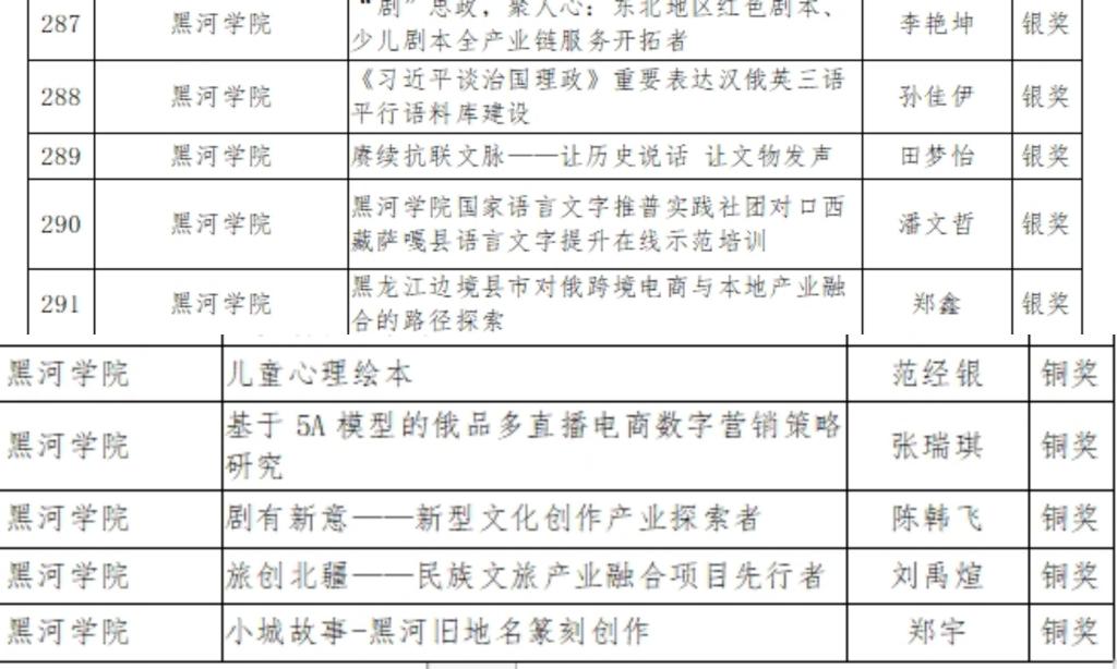 我校15个项目参加省级奖项角逐,最终取得了银奖和铜奖各5项的优异成绩。其中《剧思政,聚人心:东北地区红色剧本、少儿剧本全产业链服务开拓者》《〈习近平谈治国理政〉重要表达汉俄英三语平行语料库建设》《赓续抗联文脉——让历史说话让文物发声》《黑龙江边境县市对俄跨境电商与本地产业融合的路径探索》等4个银奖项目被省教育厅推荐参选大学生新文科实践创新大赛国赛。