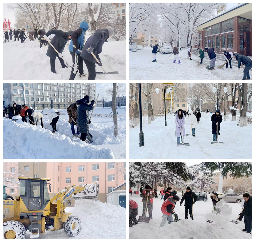 高效组织清雪工作,恢复校园通行。面对暴雪后校园雪堆成山的状况,后勤管理处积极迅速调配人力、物力资源,牵头组织开展清雪行动,召集校内保洁人员、维修工人组成专业清雪队伍,调配装载机、吹雪机等专业清雪设备,对校园的主干道、出入口等重要交通区域进行重点攻坚,快速破除厚厚的积雪“封锁”。清雪现场,后勤管理处工作人员亲自参与劳动,做好组织协调,合理分配学校清雪任务,及时调度清雪工具,保障清雪工作有条不紊地推进,确保校园主要道路和重点区域的积雪及时清理干净,使师生们能够按时安全地开展教学、学习和生活活动。