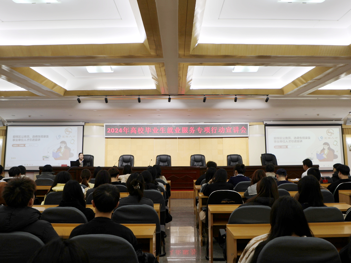 本网讯(特约记者 李绥化)12月12日我校与爱辉区就业服务中心等部门,在明德楼五楼多功能厅联合举办2024年高校毕业生就业服务专项行动政策宣讲会,会议由爱辉区就业服务中心专职副书记杨越涵主持。