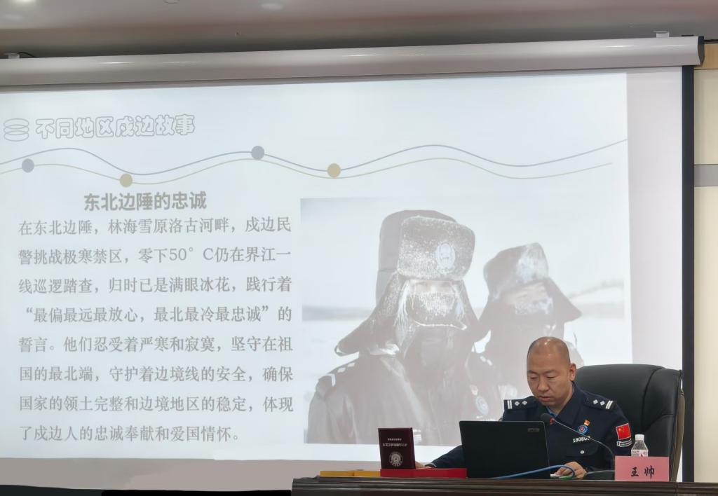 王帅与同学们分享不同地区移民管理警察的戍边故事。他讲到每一位戍边警察都深知自己肩负着保卫祖国的神圣使命,哪怕环境再恶劣,条件再艰苦,都不能有丝毫的懈怠。正是在这种极端恶劣的环境下,铸就了坚不可摧的钢铁意志。王帅还与现场的同学们进行了亲切的交流,呼吁同学们树立正确的世界观、人生观和价值观,将个人的成长与学校、国家的发展紧密结合起来,鼓励同学们努力学习科学文化知识,提高自身素质,培养坚韧不拔的意志品质,勇于面对困难和挑战,在逆境中不断成长,为将来报效祖国打下坚实的基础。