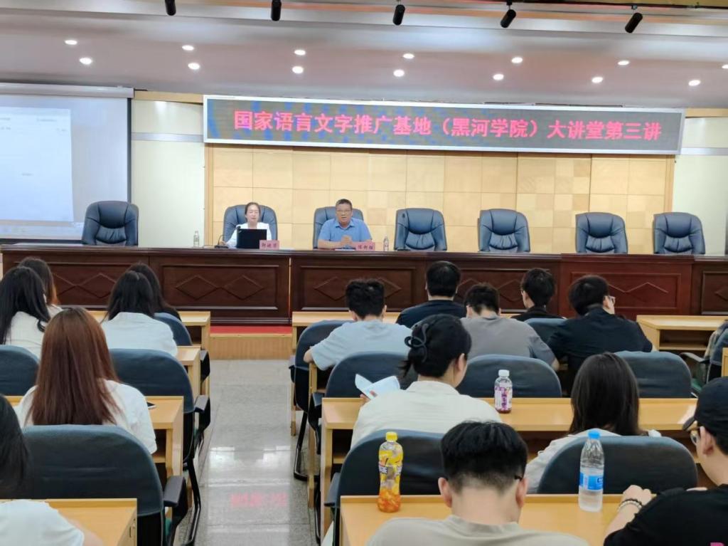 本网讯(特约记者 卢英玉)近日,我校国家语言文字推广基地在明德楼五楼多功能报告厅举办“国家语言文字推广基地大讲坛第三讲”活动。本次讲座邀请到了黑河市融媒体中心(黑河广播电视台)的高级记者郭晓芳作为主讲嘉宾。