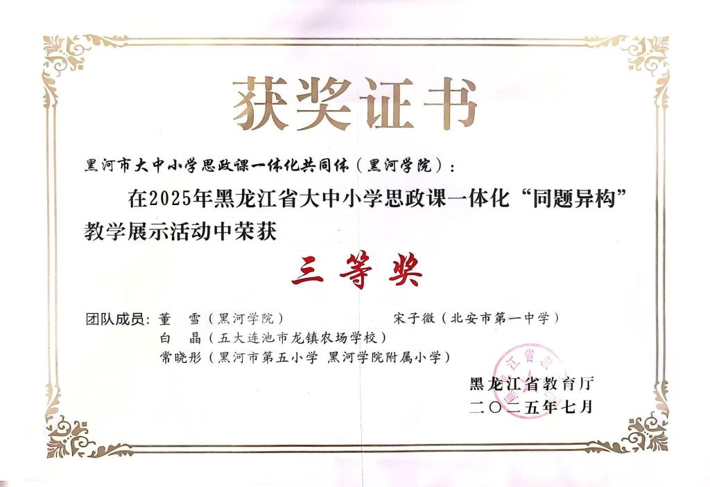 近日,黑河市大中小学思政课一体化共同体(开云足球竞猜下载)凭借扎实的教学设计与出色的现场表现,在2025年黑龙江省大中小学思政课一体化“同题异构”教学展示活动决赛中,荣获三等奖。